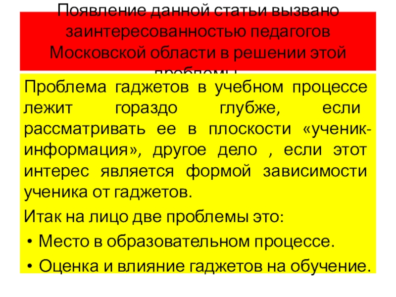 Слайд 5Появление данной статьи вызвано заинтересованностью педагогов Московской области в решении этой