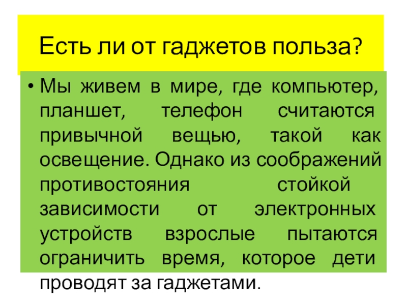 телефон считаются привычной вещью, такой как освещение. Однако из соображений противостояния стойкой зависимости от электронных устройств взрослые пытаются ограничить время, которое дети проводят за гаджетами.