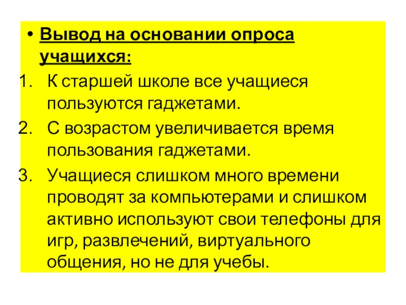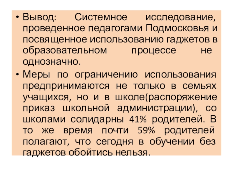 Слайд 19Вывод: Системное исследование, проведенное педагогами Подмосковья и посвященное использованию гаджетов в