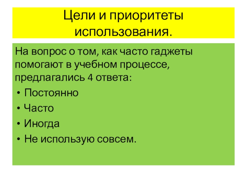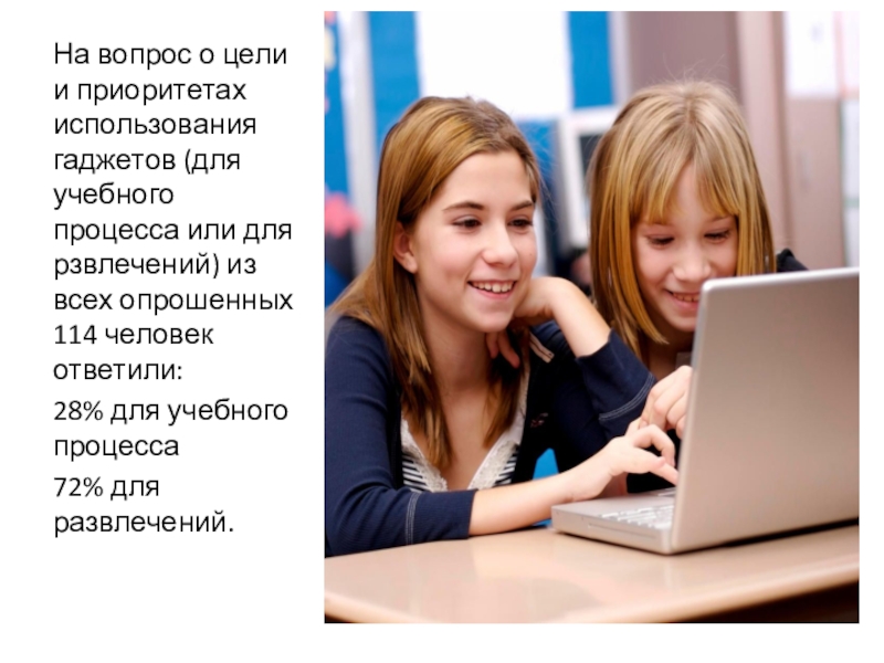 Слайд 14На вопрос о цели и приоритетах использования гаджетов (для учебного процесса
