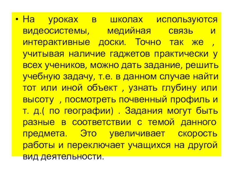 Точно так же , учитывая наличие гаджетов практически у всех учеников, можно дать задание, решить учебную задачу, т.е. в данном случае найти тот или иной объект , узнать глубину или высоту , посмотреть почвенный профиль и т. д.( по географии) . Задания могут быть разные в соответствии с темой данного предмета. Это увеличивает скорость работы и переключает учащихся на другой вид деятельности.