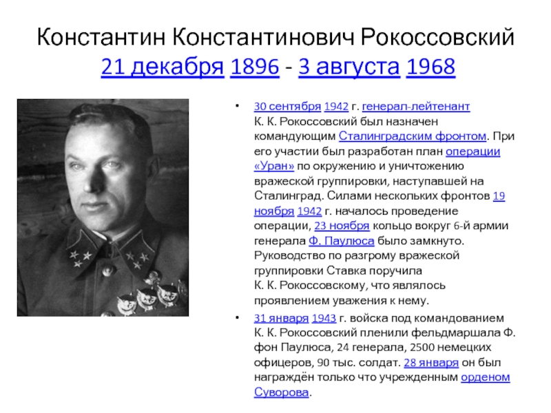 31 января 1943 г. войска под командованием К. К. Рокоссовский пленили фельдмаршала Ф. фон Паулюса, 24 генерала, 2500 немецких офицеров, 90 тыс. солдат. 28 января он был награждён только что учрежденным орденом Суворова.