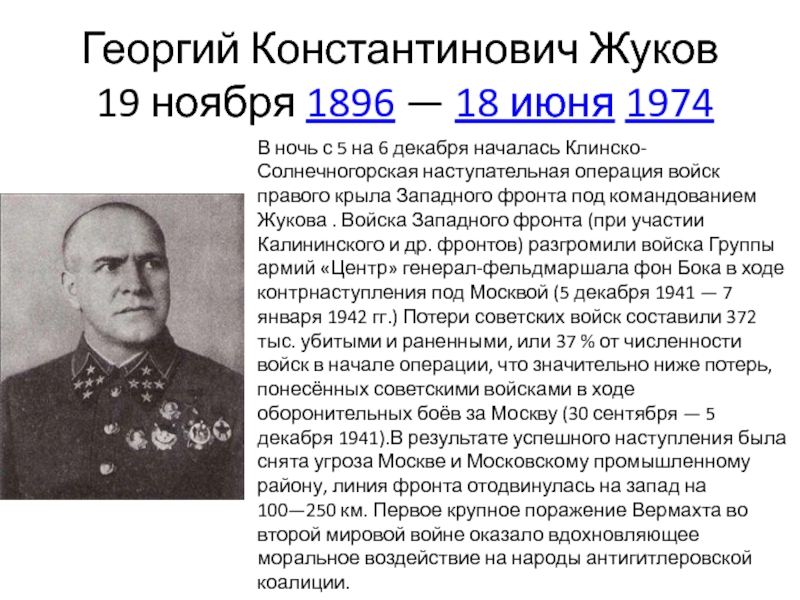 с 5 на 6 декабря началась Клинско-Солнечногорская наступательная операция войск правого крыла Западного фронта под командованием Жукова . Войска Западного фронта (при участии Калининского и др. фронтов) разгромили войска Группы армий «Центр» генерал-фельдмаршала фон Бока в ходе контрнаступления под Москвой (5 декабря 1941 — 7 января 1942 гг.) Потери советских войск составили 372 тыс. убитыми и раненными, или 37 % от численности войск в начале операции, что значительно ниже потерь, понесённых советскими войсками в ходе оборонительных боёв за Москву (30 сентября — 5 декабря 1941).В результате успешного наступления была снята угроза Москве и Московскому промышленному району, линия фронта отодвинулась на запад на 100—250 км. Первое крупное поражение Вермахта во второй мировой войне оказало вдохновляющее моральное воздействие на народы антигитлеровской коалиции.