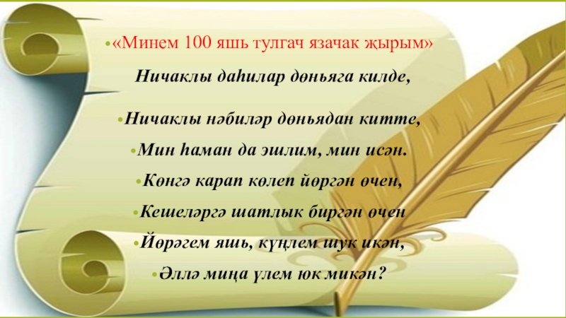 Слайд 17«Минем 100 яшь тулгач язачак җырым» Ничаклы даһилар дөньяга килде,