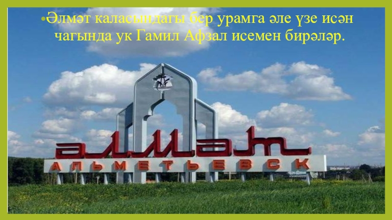 Слайд 15Әлмәт каласындагы бер урамга әле үзе исән чагында ук Гамил Афзал