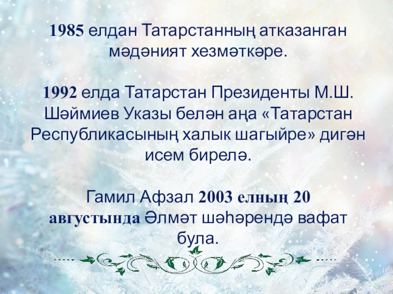 Слайд 61985 елдан Татарстанның атказанган мәдәният хезмәткәре.