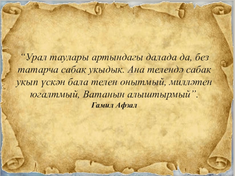 Слайд 10“Урал таулары артындагы далада да, без татарча сабак укыдык. Ана телендә