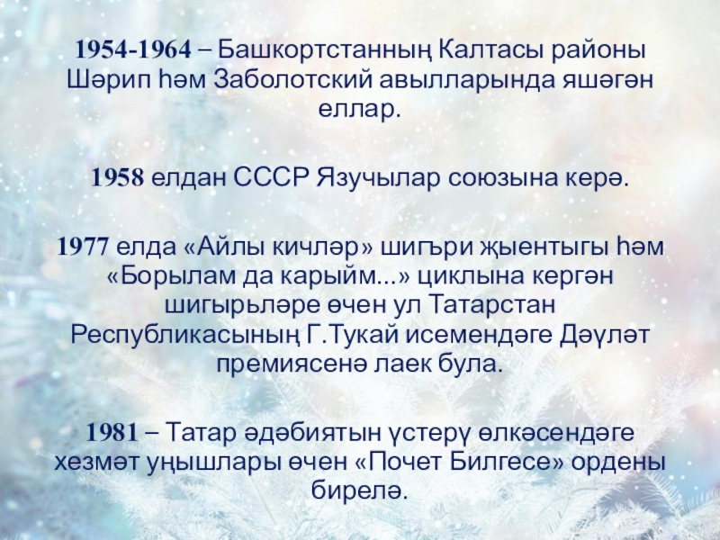 Слайд 51954-1964 – Башкортстанның Калтасы районы Шәрип һәм Заболотский авылларында яшәгән еллар.