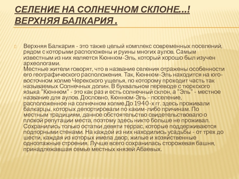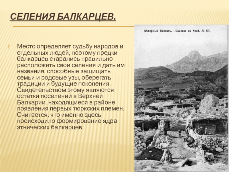 старались правильно расположить свои селения и дать им названия, способные защищать семьи и родовые узы, оберегать традиции и будущие поколения. Свидетельством этому являются остатки поселений в Верхней Балкарии, находящиеся в районе появления первых тюркских племен. Считается, что именно здесь происходило формирование ядра этнических балкарцев.