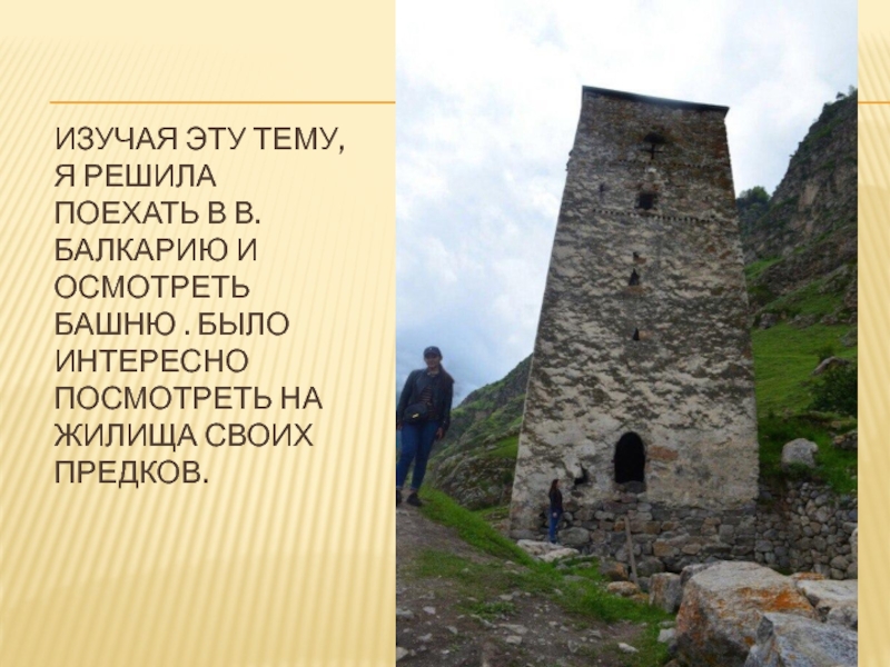 Слайд 25Изучая эту тему, я решила поехать в В.Балкарию и осмотреть башню