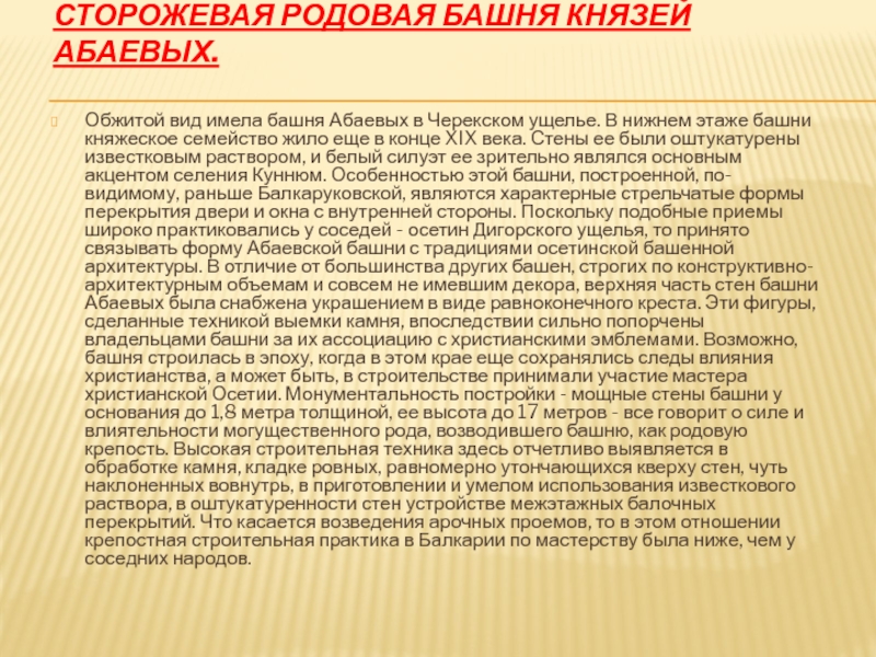 ущелье. В нижнем этаже башни княжеское семейство жило еще в конце XIX века. Стены ее были оштукатурены известковым раствором, и белый силуэт ее зрительно являлся основным акцентом селения Куннюм. Особенностью этой башни, построенной, по-видимому, раньше Балкаруковской, являются характерные стрельчатые формы перекрытия двери и окна с внутренней стороны. Поскольку подобные приемы широко практиковались у соседей - осетин Дигорского ущелья, то принято связывать форму Абаевской башни с традициями осетинской башенной архитектуры. В отличие от большинства других башен, строгих по конструктивно-архитектурным объемам и совсем не имевшим декора, верхняя часть стен башни Абаевых была снабжена украшением в виде равноконечного креста. Эти фигуры, сделанные техникой выемки камня, впоследствии сильно попорчены владельцами башни за их ассоциацию с христианскими эмблемами. Возможно, башня строилась в эпоху, когда в этом крае еще сохранялись следы влияния христианства, а может быть, в строительстве принимали участие мастера христианской Осетии. Монументальность постройки - мощные стены башни у основания до 1,8 метра толщиной, ее высота до 17 метров - все говорит о силе и влиятельности могущественного рода, возводившего башню, как родовую крепость. Высокая строительная техника здесь отчетливо выявляется в обработке камня, кладке ровных, равномерно утончающихся кверху стен, чуть наклоненных вовнутрь, в приготовлении и умелом использования известкового раствора, в оштукатуренности стен устройстве межэтажных балочных перекрытий. Что касается возведения арочных проемов, то в этом отношении крепостная строительная практика в Балкарии по мастерству была ниже, чем у соседних народов.