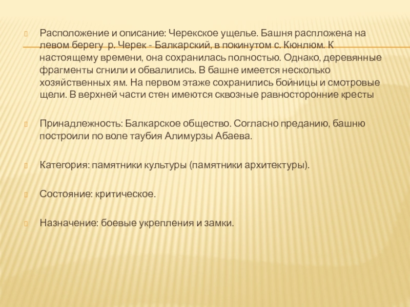 Черек - Балкарский, в покинутом с. Кюнлюм. К настоящему времени, она сохранилась полностью. Однако, деревянные фрагменты сгнили и обвалились. В башне имеется несколько хозяйственных ям. На первом этаже сохранились бойницы и смотровые щели. В верхней части стен имеются сквозные равносторонние кресты