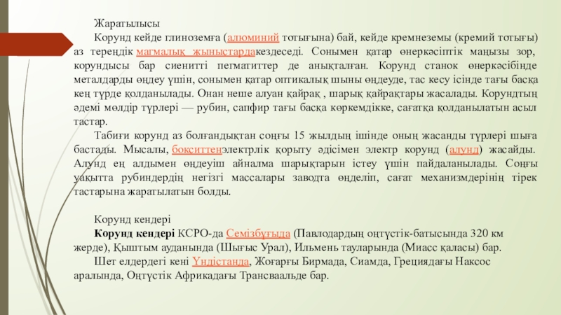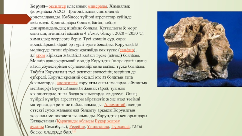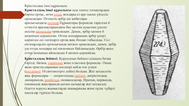 Кристалдық бейнесі. Қорундтың бейнесі кішкене бочка тәрізді, бағана, пирамида және пластика формалас. Оның жеке кристалдарының мөлшері кейде өте үлкен (көлденеңі 10 сантиметрге дейін) болады. Жиі кездесетін жақ формалары — дитригондық призма, дитригондық дипирамида, ромбоэдр, пинакоидалар. Призма, пирамида, пинакоида жақтарында қиғаш сызықтар жиі кездеседі. Әдетте корунд жыныстарда шашыранды және тұтас түйірлі массалар түрінде болады.