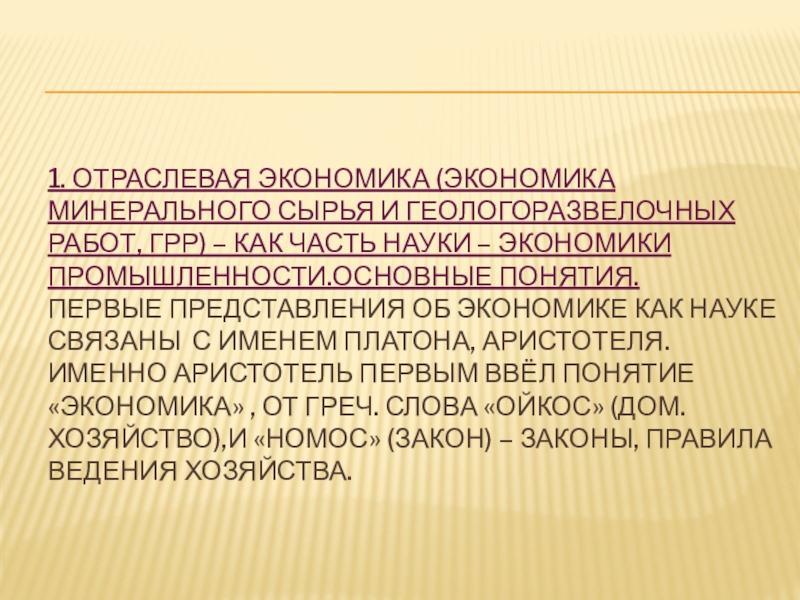 План : 1.Отраслевая экономика (Экономика минерального сырья и геологоразведочных работ, ГРР)- как часть науки – экономики промышленности. Основные понятия.