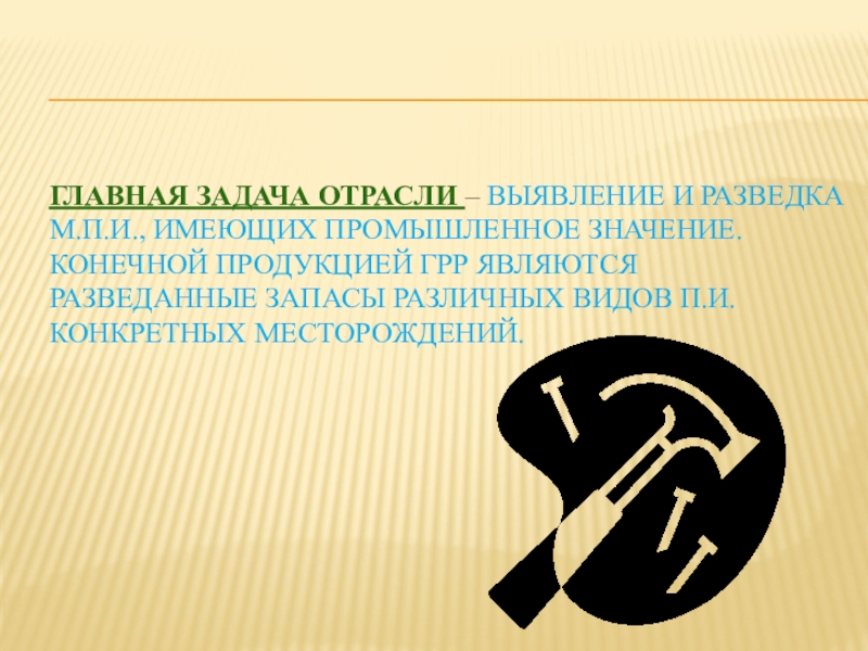 Слайд 9Главная задача отрасли – выявление и разведка м.п.и., имеющих промышленное значение.