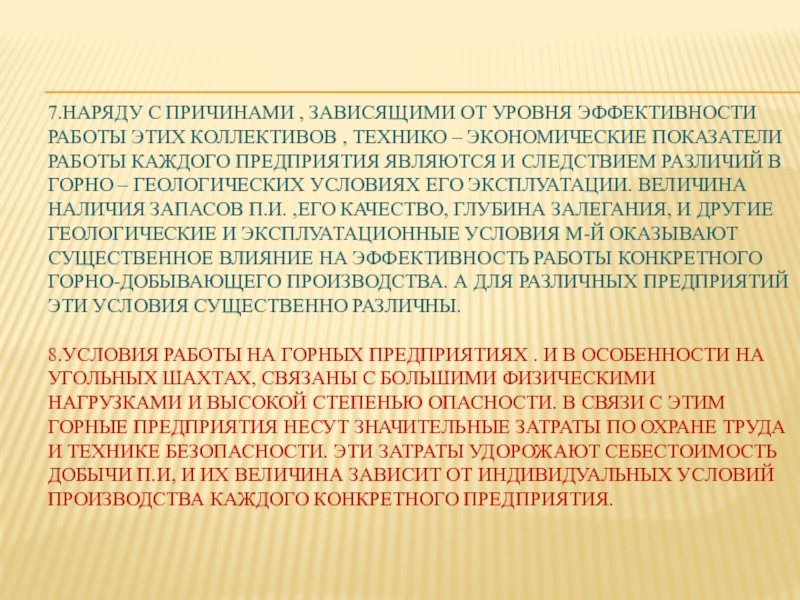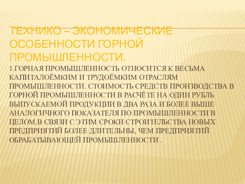 Слайд 13Технико – экономические особенности горной промышленности.