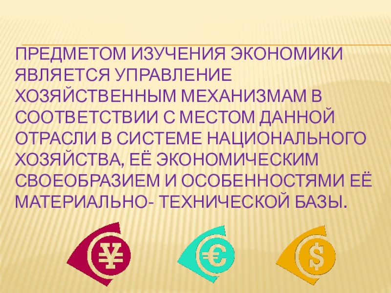 Слайд 7Предметом изучения экономики является управление хозяйственным механизмам в соответствии с местом