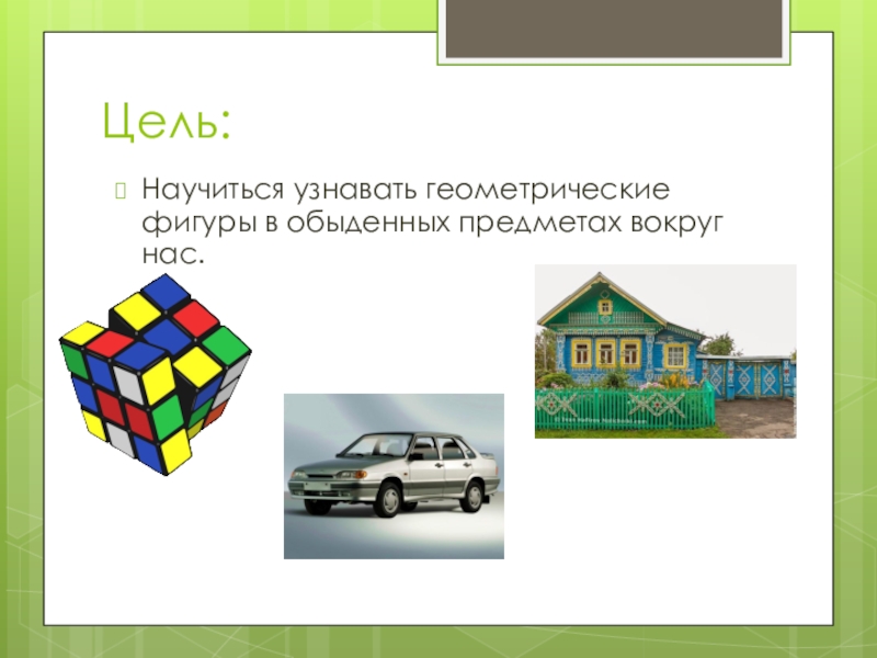 Цель:Научиться узнавать геометрические фигуры в обыденных предметах вокруг нас.