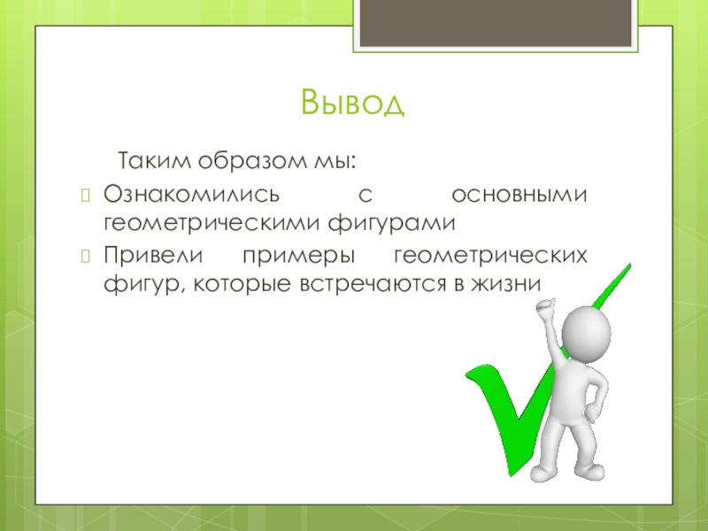 ВыводТаким образом мы:Ознакомились с основными геометрическими фигурамиПривели примеры геометрических фигур, которые встречаются в жизни