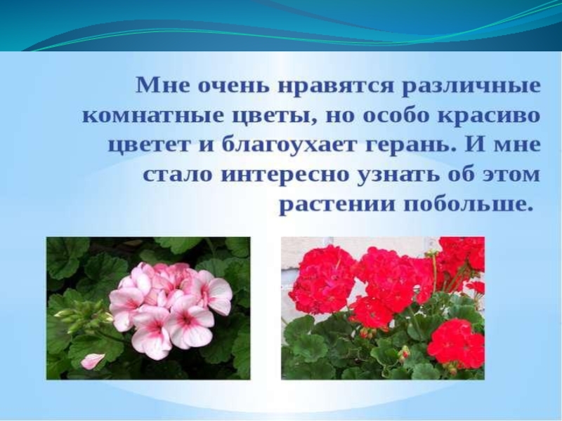 Цель исследовательской работы:Выращивание комнатных растений. Задачи:1. Прочитать о герани в энциклопедии.2. Изучить лекарственные свойства герани.3. Изучить способы