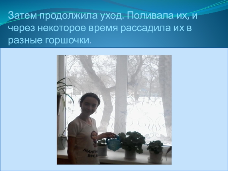 Слайд 19Затем продолжила уход. Поливала их, и через некоторое время рассадила их