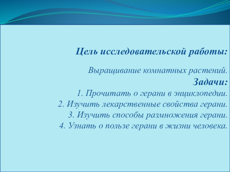 Цель исследовательской работы:Выращивание комнатных растений. Задачи:1. Прочитать о герани в энциклопедии.2. Изучить лекарственные свойства герани.3. Изучить способы размножения герани.4. Узнать о пользе герани в жизни человека.