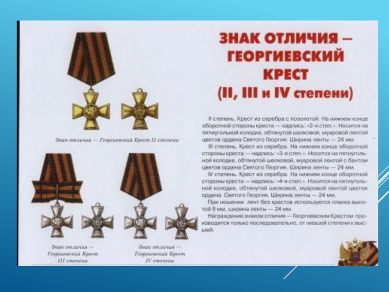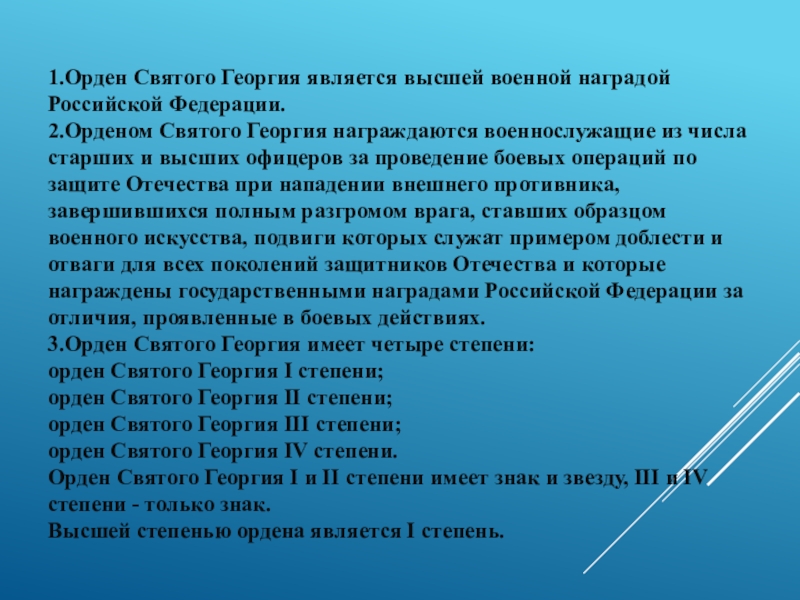 1.Орден Святого Георгия является высшей военной наградой Российской Федерации. 2.Орденом Святого Георгия награждаются военнослужащие из числа старших