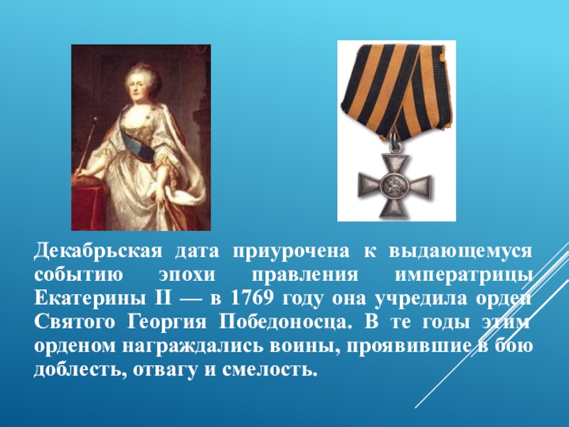Декабрьская дата приурочена к выдающемуся событию эпохи правления императрицы Екатерины II — в 1769 году она учредила