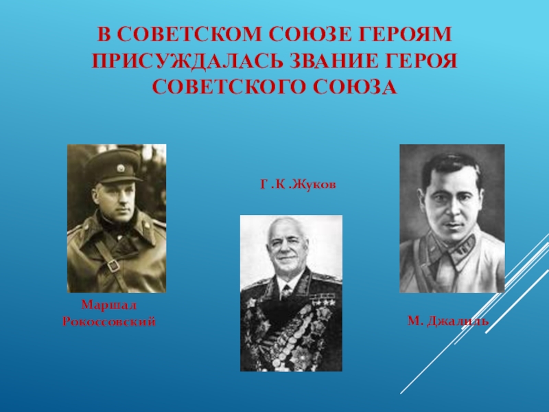 В Советском союзе героям присуждалась звание Героя Советского СоюзаМаршалРокоссовскийГ .К .ЖуковМ. Джалиль
