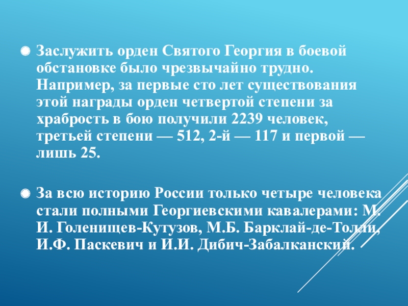 Слайд 15Заслужить орден Святого Георгия в боевой обстановке было чрезвычайно трудно. Например,