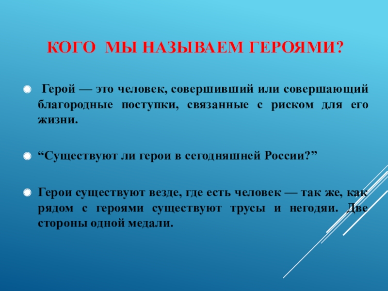 Кого мы называем Героями? Герой — это человек, совершивший или совершающий благородные поступки, связанные с риском для