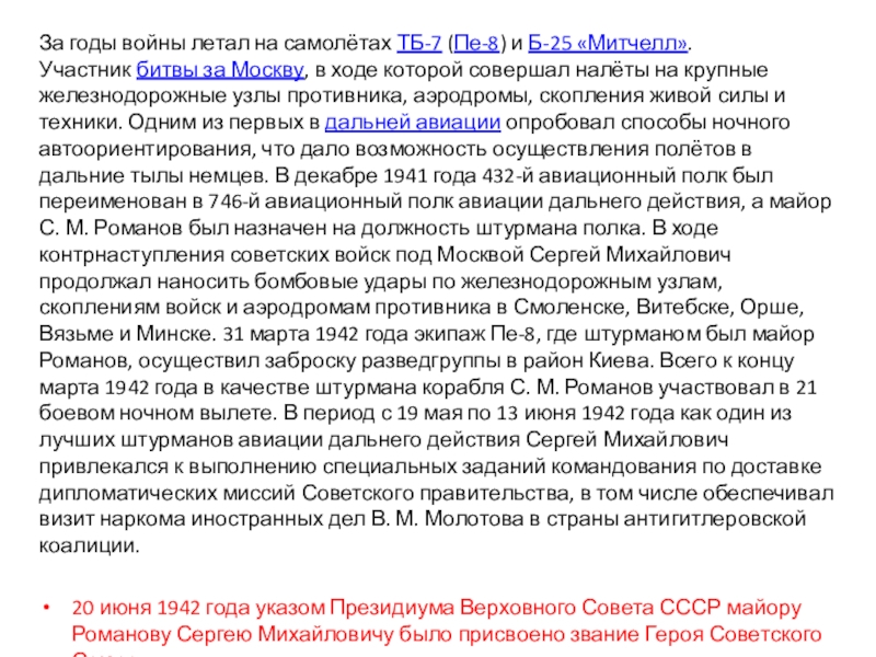Слайд 3За годы войны летал на самолётах ТБ-7 (Пе-8) и Б-25 «Митчелл». Участник битвы за Москву,