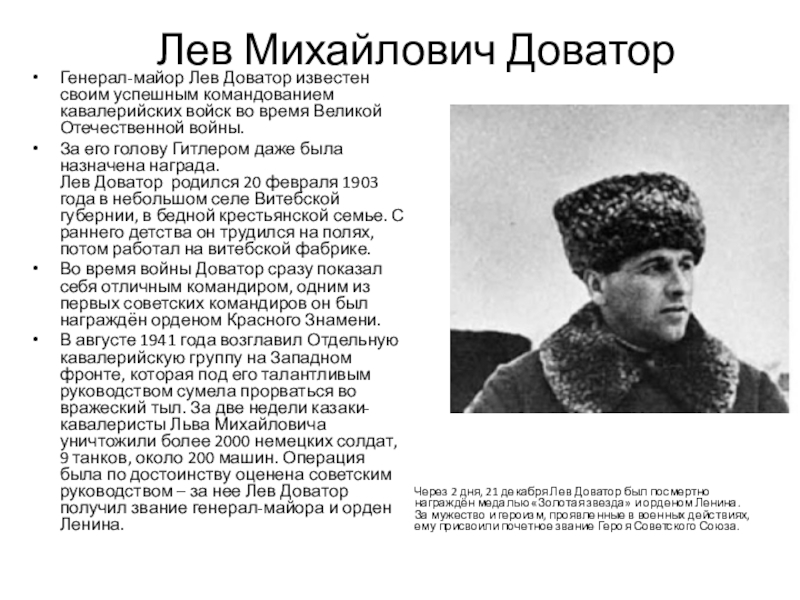 Генерал-майор Лев Доватор известен своим успешным командованием кавалерийских войск