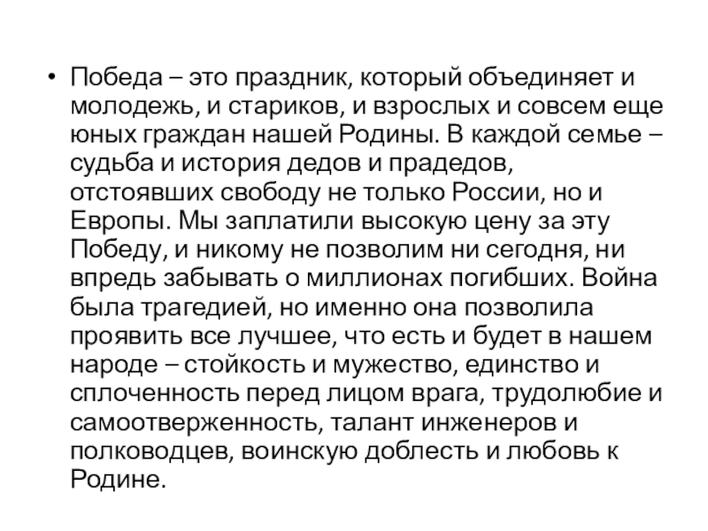 взрослых и совсем еще юных граждан нашей Родины. В каждой семье – судьба и история дедов и прадедов, отстоявших свободу не только России, но и Европы. Мы заплатили высокую цену за эту Победу, и никому не позволим ни сегодня, ни впредь забывать о миллионах погибших. Война была трагедией, но именно она позволила проявить все лучшее, что есть и будет в нашем народе – стойкость и мужество, единство и сплоченность перед лицом врага, трудолюбие и самоотверженность, талант инженеров и полководцев, воинскую доблесть и любовь к Родине.