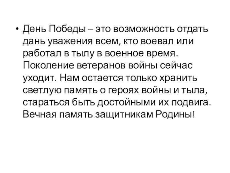 Слайд 13День Победы – это возможность отдать дань уважения всем, кто воевал