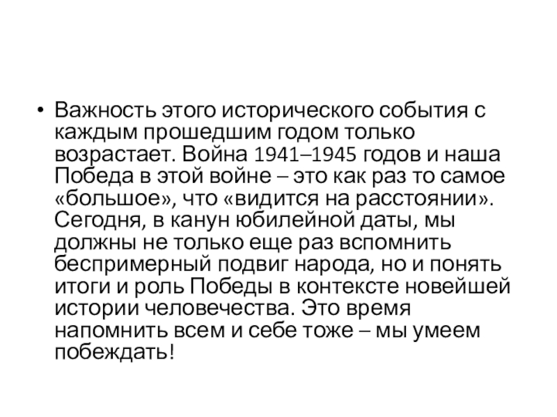 1941–1945 годов и наша Победа в этой войне – это как раз то самое «большое», что «видится на расстоянии». Сегодня, в канун юбилейной даты, мы должны не только еще раз вспомнить беспримерный подвиг народа, но и понять итоги и роль Победы в контексте новейшей истории человечества. Это время напомнить всем и себе тоже – мы умеем побеждать!