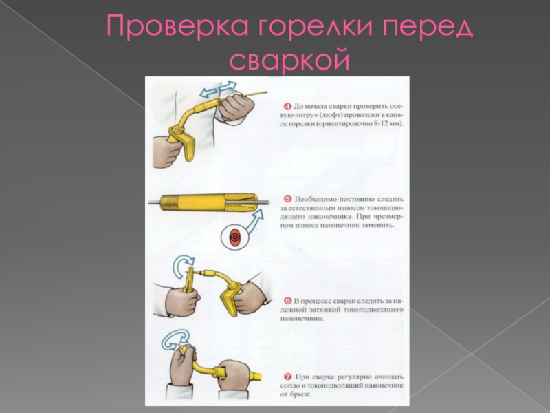 Слайд 4Сварочные горелки предназначены для подвода к месту сварки электродной проволоки, сварочного тока
