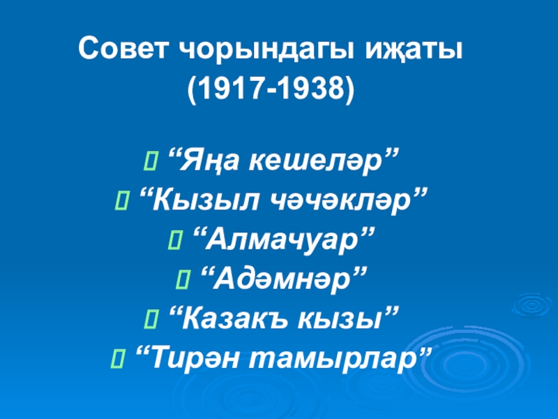 Совет чорындагы иҗаты (1917-1938) “Яңа кешеләр”“Кызыл чәчәкләр”“Алмачуар”“Адәмнәр”“Казакъ кызы”“Тирән тамырлар”
