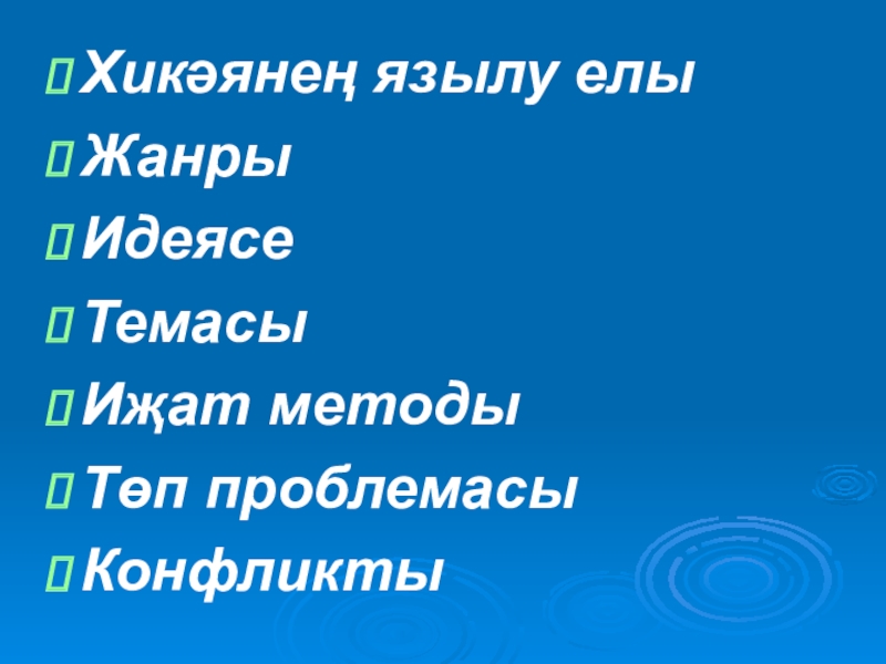 Хикәянең язылу елыЖанрыИдеясеТемасыИҗат методыТөп проблемасыКонфликты