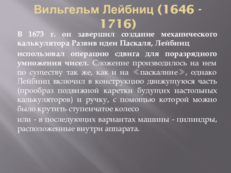 Слайд 9В 1673 г. он завершил создание механического калькулятора Развив идеи Паскаля,