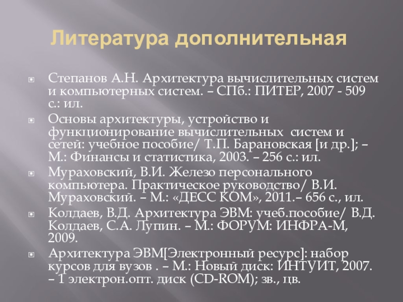 Колдаев, В.Д. Архитектура ЭВМ: учеб.пособие/ В.Д. Колдаев, С.А. Лупин. – М.: ФОРУМ: ИНФРА-М, 2009.