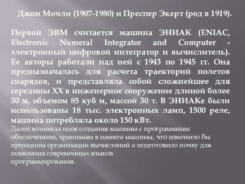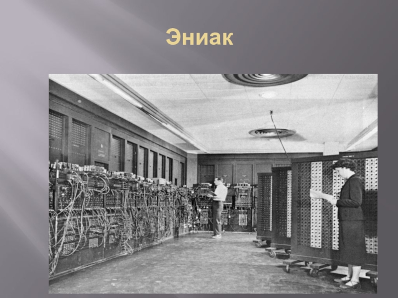 машина ЭНИАК (ENIAC, Electronic Numeral Integrator and Computer - электронный цифровой интегратор и вычислитель). Ее авторы работали над ней с 1943 по 1945 гг. Она предназначалась для расчета траекторий полетов снарядов, и представляла собой сложнейшее для середины XX в инженерное сооружение длиной более 30 м, объемом 85 куб м, массой 30 т. В ЭНИАКе были использованы 18 тыс. электронных ламп, 1500 реле, машина потребляла около 150 кВт.