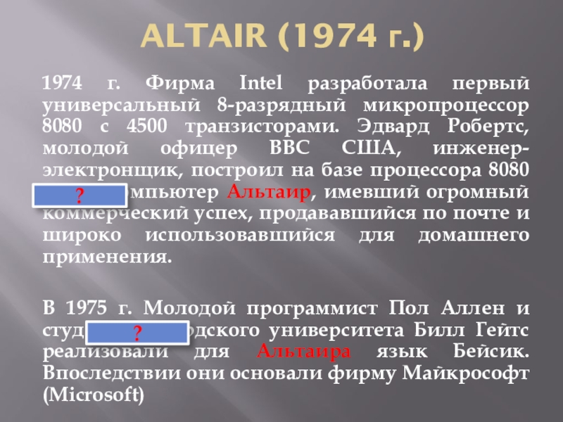 В 1975 г. Молодой программист Пол Аллен и студент Гарвардского университета Билл Гейтс реализовали для Альтаира язык Бейсик. Впоследствии они основали фирму Майкрософт (Microsoft)