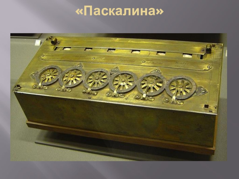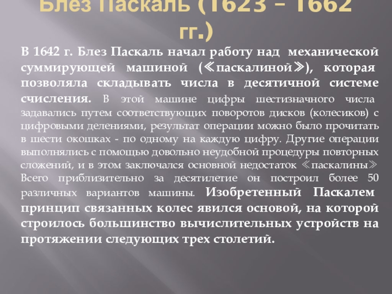 работу над механической суммирующей машиной (≪паскалиной≫), которая позволяла складывать числа в десятичной системе счисления. В этой машине цифры шестизначного числа задавались путем соответствующих поворотов дисков (колесиков) с цифровыми делениями, результат операции можно было прочитать в шести окошках - по одному на каждую цифру. Другие операции выполнялись с помощью довольно неудобной процедуры повторных сложений, и в этом заключался основной недостаток ≪паскалины≫ Всего приблизительно за десятилетие он построил более 50 различных вариантов машины. Изобретенный Паскалем принцип связанных колес явился основой, на которой строилось большинство вычислительных устройств на протяжении следующих трех столетий.