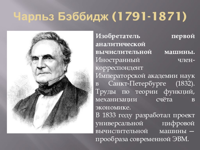 Изобретатель первой аналитической вычислительной машины. Иностранный член-корреспондент Императорской академии