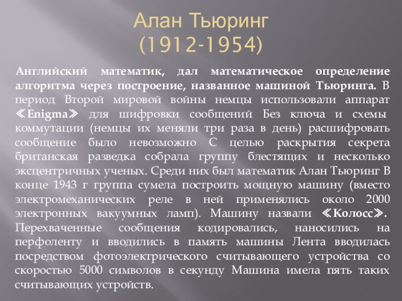 Тьюринга. В период Второй мировой войны немцы использовали аппарат ≪Enigma≫ для шифровки сообщений Без ключа и схемы коммутации (немцы их меняли три раза в день) расшифровать сообщение было невозможно С целью раскрытия секрета британская разведка собрала группу блестящих и несколько эксцентричных ученых. Среди них был математик Алан Тьюринг В конце 1943 г группа сумела построить мощную машину (вместо электромеханических реле в ней применялись около 2000 электронных вакуумных ламп). Машину назвали ≪Колосс≫. Перехваченные сообщения кодировались, наносились на перфоленту и вводились в память машины Лента вводилась посредством фотоэлектрического считывающего устройства со скоростью 5000 символов в секунду Машина имела пять таких считывающих устройств.