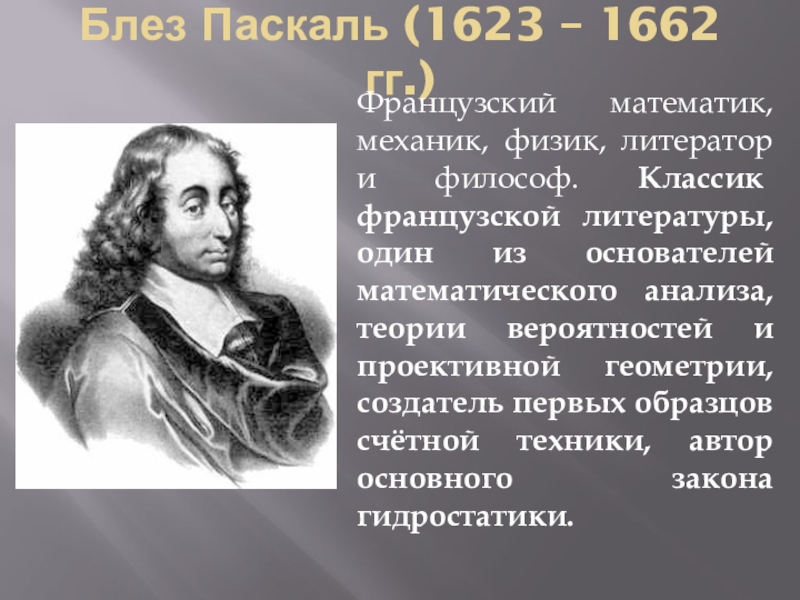 Слайд 5Блез Паскаль (1623 – 1662 гг.)