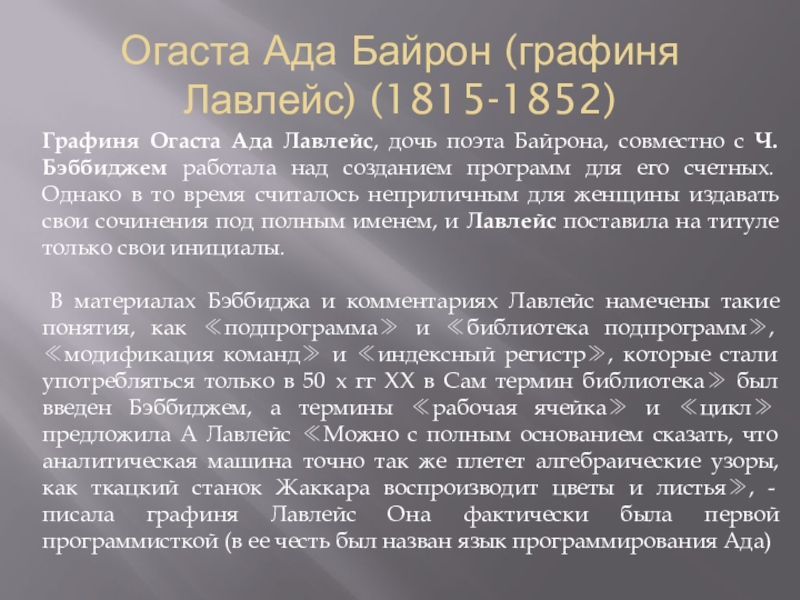 В материалах Бэббиджа и комментариях Лавлейс намечены такие понятия, как ≪подпрограмма≫ и ≪библиотека подпрограмм≫, ≪модификация команд≫ и ≪индексный регистр≫, которые стали употребляться только в 50 х гг XX в Сам термин библиотека≫ был введен Бэббиджем, а термины ≪рабочая ячейка≫ и ≪цикл≫ предложила А Лавлейс ≪Можно с полным основанием сказать, что аналитическая машина точно так же плетет алгебраические узоры, как ткацкий станок Жаккара воспроизводит цветы и листья≫, - писала графиня Лавлейс Она фактически была первой программисткой (в ее честь был назван язык программирования Ада)