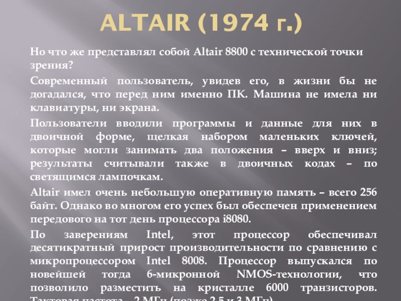 Altair имел очень небольшую оперативную память – всего 256 байт. Однако во многом его успех был обеспечен применением передового на тот день процессора i8080.