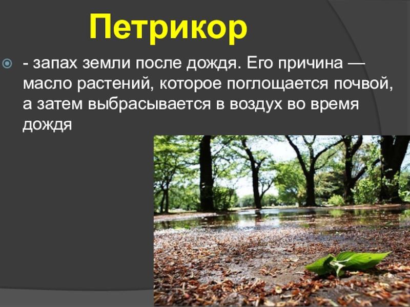 Петрикор- запах земли после дождя. Его причина — масло растений, которое поглощается почвой, а затем выбрасывается в